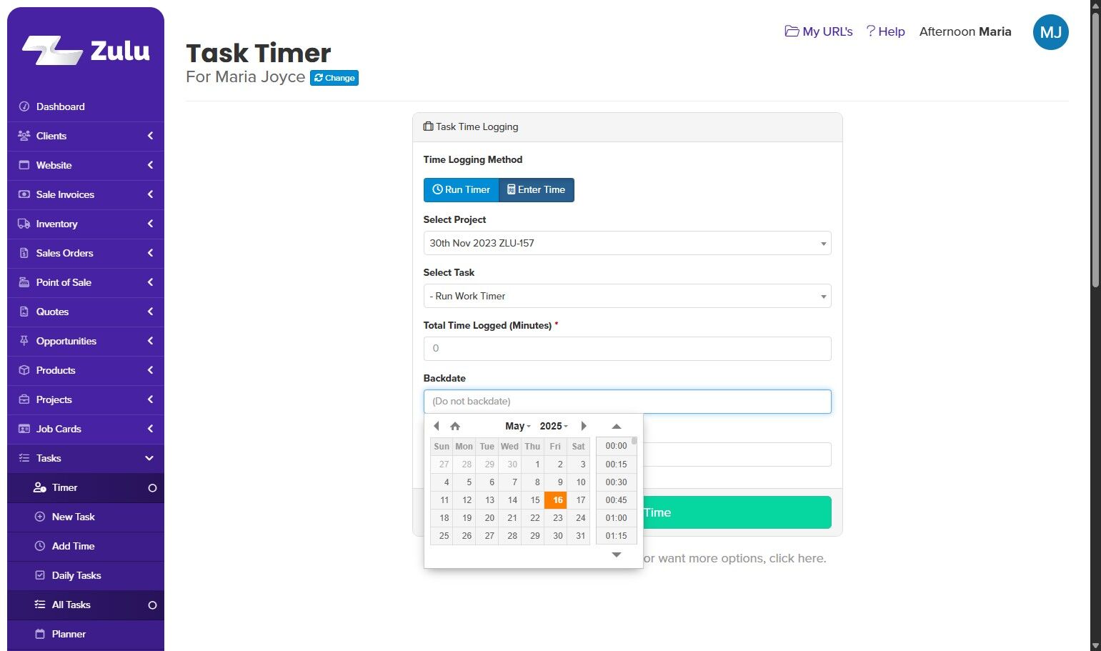 6. You may have the option to backdate your time to a project by choosing a date under Backdate section.